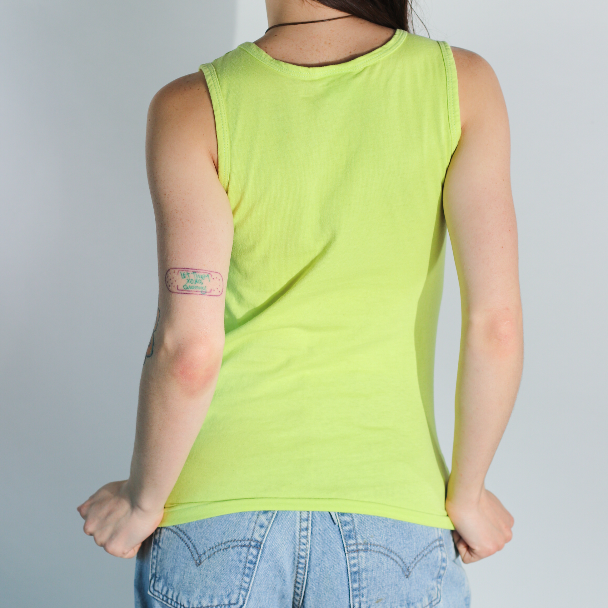 Bright green-yellow vintage athletic tank top with three retro flower block prints in red, green, and orange. One of a kind, original wearable art. 100% cotton for a quality and long lasting top.